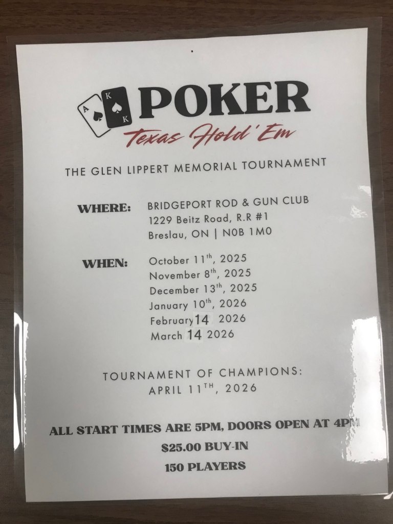 Meat Shoot & Poker Updates Posted byBridgeport Rod & Gun ClubOctober 16, 2025January 19, 2026Posted inBRGC Update Please contact one of the Directors from “Field & Stream” if you have any questions. Related